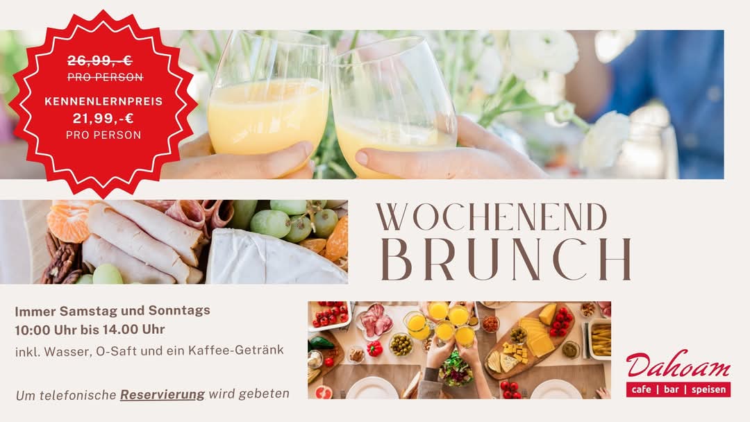 Ab sofort bieten wir euch jedes Wochenende ein gemütliches Brunchbuffet mit Baguette, Brezen, Croissants, Obstsalat, Müsli, Joghurt, Avocado, Lachs, Wurstplatte, Käseplatte, frischem Gemüse und vielem mehr an! Im Preis sind zudem Wasser, Orangensaft und eine Kaffeevariation enthalten.
